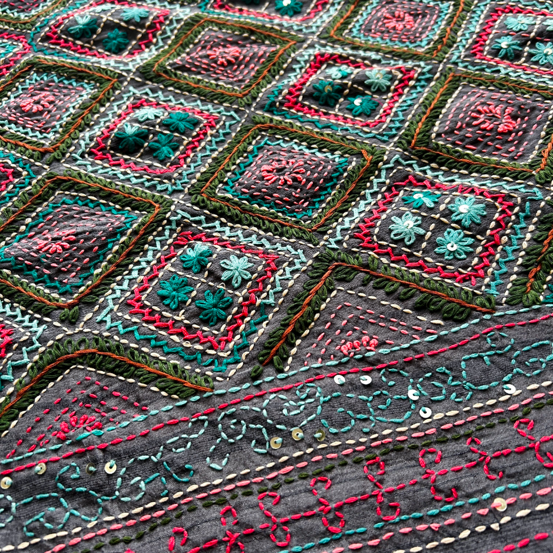Elegant and rooted in rich tribal artistry, this grey semi tussar silk saree is a beautiful expression of handcrafted heritage. Featuring intricate handwoven Lambani (Banjara) embroidery, the saree showcases geometric motifs brought to life with vibrant threadwork, reflecting the soul of traditional Indian craftsmanship.