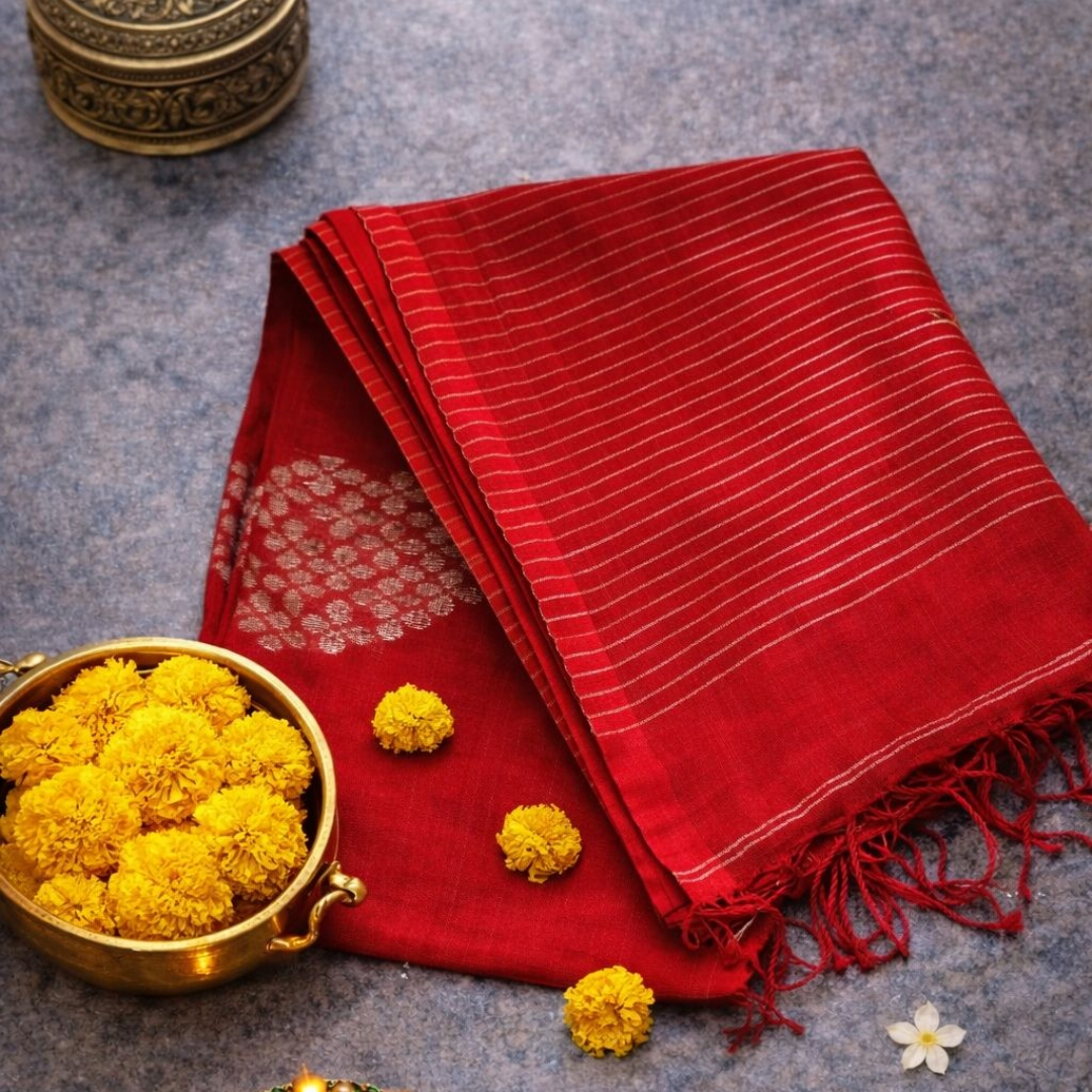 Pure Linen Jamdani Saree with Zari Striped Pallu – Tomato Red & Pink | Mriksha saree